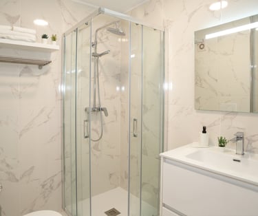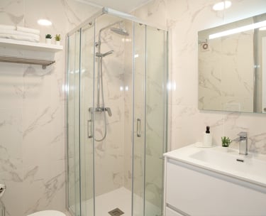 Questo alloggio è situato al primo piano di un edificio dotato di ascensore. Dispone di due camere da letto (una matrimoniale e una con due letti singoli) e di due bagni con doccia. La cucina, dotata di tutto il necessario per cucinare, è separata dal soggiorno. In quest'ultimo ambiente ampio e luminoso sono collocati un lungo tavolo e un grande divano.